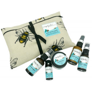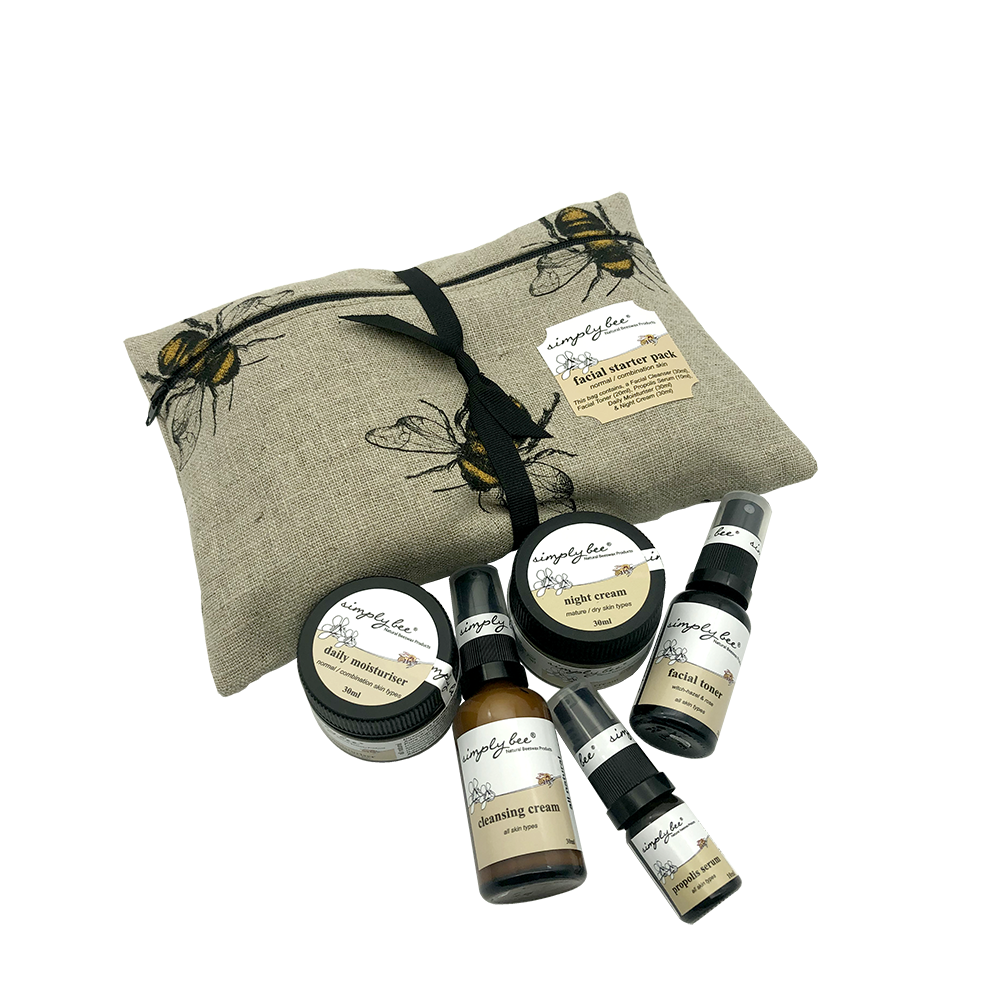30ml Cleanser, 30ml Toner, 30ml Daily Moisturiser, 10ml Serum and 30ml Night cream in a beautiful Simply Bee cosmetic bag.