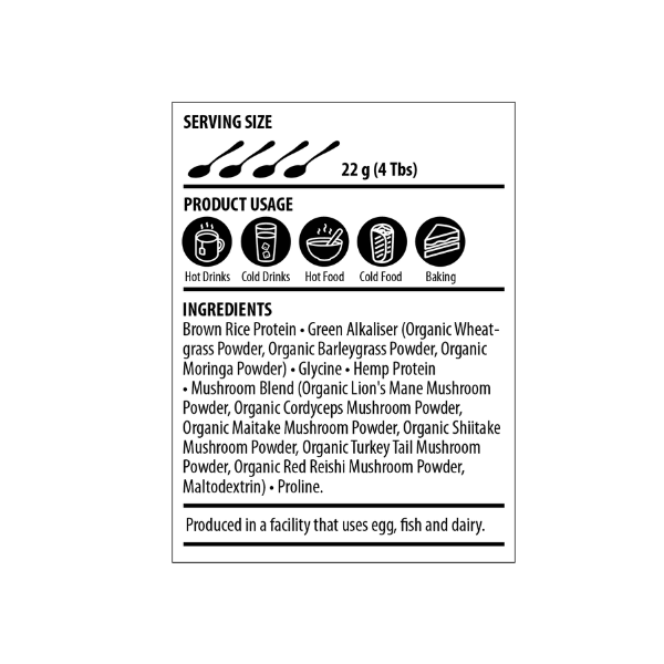 Brown Rice protein, Green Alkaliser [Organic Wheatgrass Powder, Organic Barleygrass Powder, Organic Moringa Powder], Glycine, Hemp Protein, Mushroom Blend [Organic Lion’s Mane Mushroom Powder, Organic Cordyceps Mushroom Powder, Organic Maitake Mushroom Powder, Organic Shiitake Mushroom Powder, Organic Turkey Tall Mushroom Powder, Organic Red Reishi Mushroom Powder, Maltodextrin]